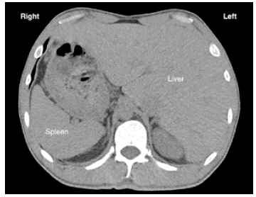 After finding dextrocardia, it was necessary to ascertain visceral situs (normal, inverted, ambiguous). A simple tomography documented pulmonary bronchiectasis, as well as liver on the left side (Figure 4), leading to suspect KS; this was confirmed with findings of chronic sinusitis in paranasal sinus tomography. In addition, HRCT showed tomographic signs of infectious bronchiolitis.