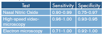 PKD diagnosis is confirmed by the presence of one or more of the criteria proposed by the European Society of Pneumology: low levels of nasal nitric oxide, frequency of ciliary oscillation ≤-11Hz by high speed videomicroscopy from ciliary biopsy or more than 20-30% of ciliary ultra-structural abnormalities by electron microscopy (Table 1). 9