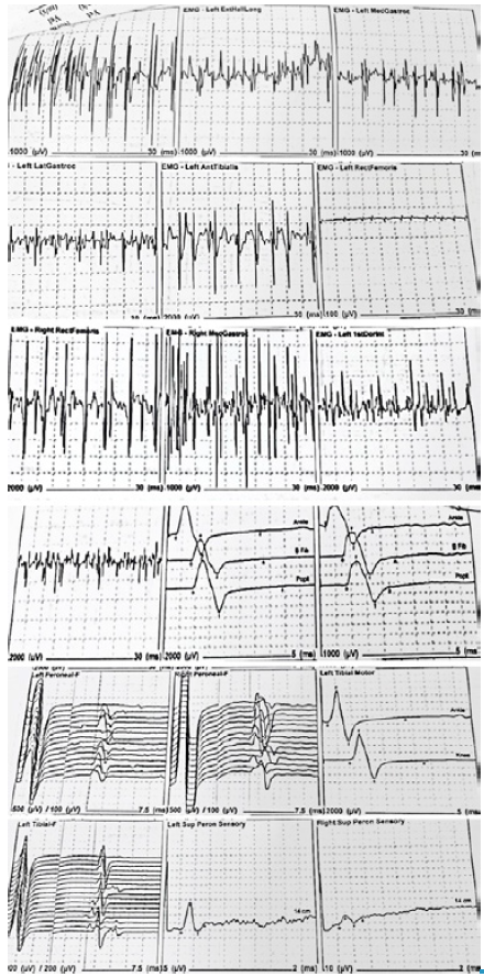 Figure 2 shows normal motor conduction velocities and amplitudes of motor evoked potentials, although the amplitude was lower in the left peroneum than in the right side by 50%, in spite of having normal parameters. The muscles of the upper limbs and the distal and dorsal latencies were normal; the amplitude and sensory conduction velocities of sensory potentials were also normal. The EMG showed signs of bilateral chronic denervation in the lower limbs, with a decrease in the recruitment of potential motor units and some polyphasic potentials.