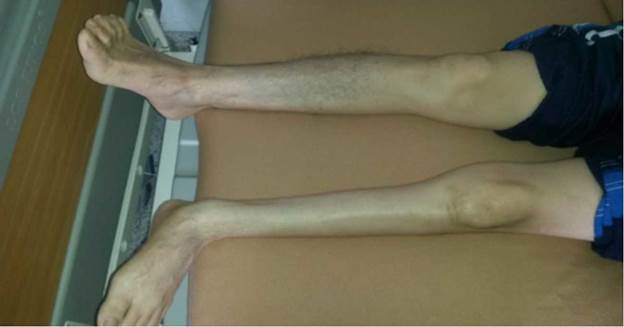 In addition to the initial symptoms, the patient reported fatigue when walking and myalgias with weakness in the left lower limb. Upon exploration of lower limbs, evidence of negative Patrick's test, intense muscular atrophy in the gastrocnemius and tibialis anterior muscles (with normal knee joint balance), lower extremity strength of 4/5, positive reflexes and preserved sensitivity were observed (Figure 3). Clinically, possible hip and sacroiliac joint pathology was ruled out. Although EMG was not performed, clinical differential diagnoses, such as a lumbar hernia, were ruled out through spinal magnetic resonance, which in turn ruled out nerve root compression.