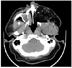 Eleven years after the initial surgery, and after 3 surgeries, a new local relapse was discovered. On physical examination, the patient was found in good condition, with left facial palsy and mass in left masticator space with extension to hard and soft palate, in addition to left submandibular ganglion conglomerate. Contrasted CT showed a mass that involved the left masticator space, lobed, of heterogeneous density with extension towards the skull and average cranial fossa of 36.7x53.6x42mm in anteroposterior section (Figures 3 and 4); biopsy and histopathological study confirmed ameloblastoma.