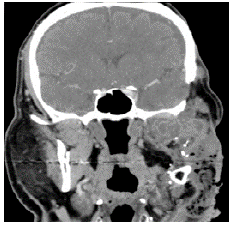 The patient underwent medical check-ups and contrasted sinus and chest CT every six months during the first year and then every year. After three years of follow-up, in an outpatient control consultation, the patient was found in good general condition, with adequate Weber-Fergusson's approach facial scar, left peripheral facial palsy, adequate mouth opening, island flap of the skin with vital and integrated fibula, left hemifacial induration of soft tissues and scalp lesion in left temporal region that extended to the parietal region with anteroposterior diameter of 7cm, without further pathological findings.