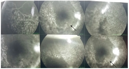Also in November 2017, fluorescein angiography of both eyes was performed (Figure 1), which showed mild media opacity in the right eye, poorly defined optic disc, fibrovascular proliferation in the optic disc area and the lower area, adequate filling and transit of the dye through retinal vessels since the beginning, with hyperfluorescence observed in the optic disc that increased as the angiographic transit progressed. Given the findings, a treated viral vasculitis was considered with secondary viral neovascularization and persistence of proliferative activity with suspicion of diffuse macular edema, the latter according to the reading of the retina specialist.