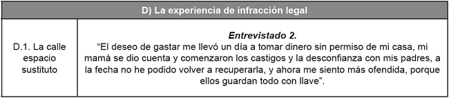 Para los entrevistados, el espacio de la calle adquiere un carácter habitual, al que están acostumbrados, es un espacio rutinario, que genera un conflicto, ya que se forman tres procesos de socialización, el institucional que impone su modelo normativo, el familiar que se vuelve deficiente y una socialización de la calle.