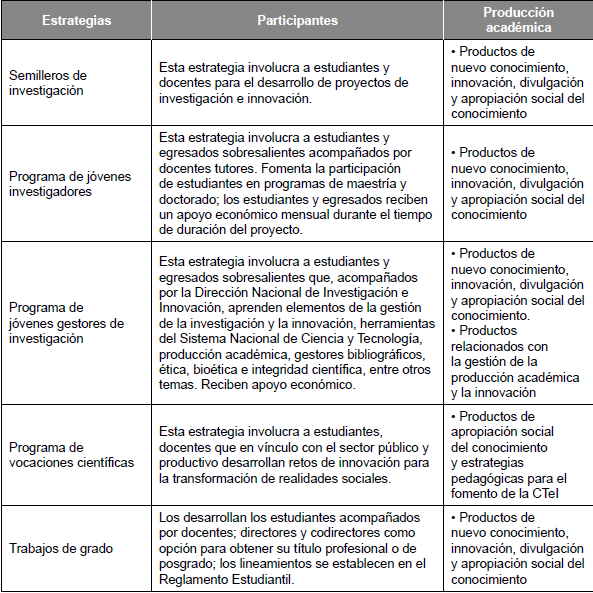 Jóvenes investigadores. En esta estrategia participan estudiantes y egresados destacados seleccionados a través de convocatoria, que aportan a los grupos de investigación en el desarrollo de sus proyectos como auxiliares y asistentes de investigación. Los estudiantes y/o egresados participantes reciben apoyo económico durante el tiempo de duración del proyecto (Ostos Ortiz, Londoño Bernal y Jiménez Zapata, 2020; Romero, 2007).