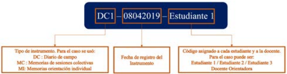 En total, se analizaron treinta y cinco diarios de campo, ocho memorias colectivas y quince memorias de la orientación individual. Esta información fue codificada indicando el tipo de instrumento, el número consecutivo, la fecha y los datos de la persona que lo produce, tal y como se muestra en la figura 1.