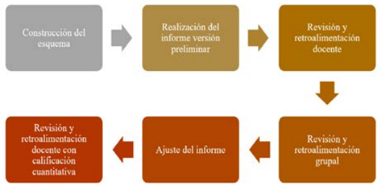 Por lo anterior, el proceso de planificación, elaboración y revisión de los informes se compone de la construcción de un esquema del texto, la realización del informe, la revisión y retroalimentación docente, la revisión y retroalimentación grupal, el ajuste del informe y la retroalimentación docente con calificación cuantitativa (figura 2).