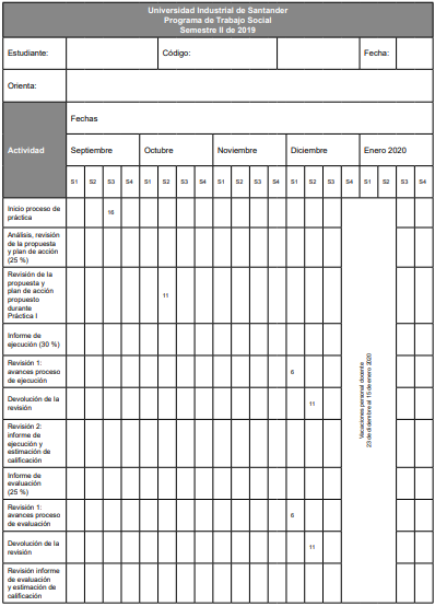 De esta manera, como paso previo al primer encuentro con las estudiantes y acorde a los requisitos institucionales, se selecciona el material básico de lectura que sea pertinente a los campos de intervención; para el caso, las estudiantes se vinculan a procesos de desarrollo comunitario en el campo de ambiente, hábitat humano y territorio, un escenario emergente en la Escuela. Asimismo, se construye un cronograma de trabajo que se ajusta a los tiempos académicos, y se establecen, por acuerdo, las equivalencias cuantitativas para el momento de la intervención; esto se realiza al inicio de las Prácticas I y II. En la tabla 1 se observa un ejemplo de la planeación.