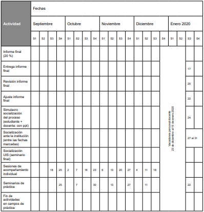 […] una de las cosas que considero que debe tenerse en cuenta en la práctica es el manejo del tiempo a nivel interno en comparación al externo, es decir, lo establecido por la escuela, lo que pide la organización y lo que pasa en la comunidad. Los tiempos de la universidad nos presionan y aunque la profesora es flexible, en ocasiones por cumplir se hace un trabajo poco consciente y con poca disposición. (MC7_28082019_Estudiante2)