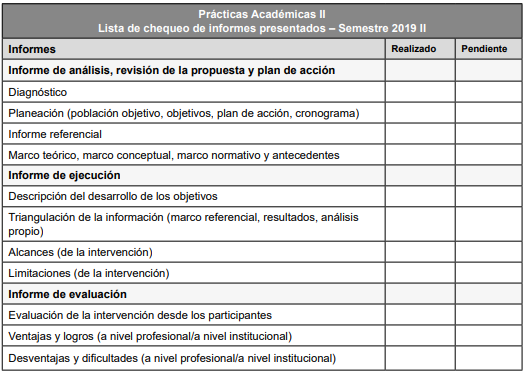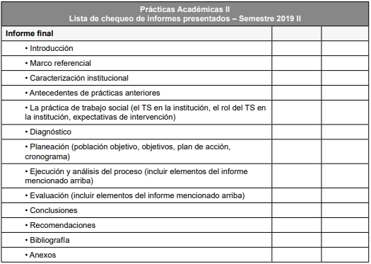 Para tal fin, se propone la construcción de cuatro informes que deben dar cuenta del proceso: el primero se basa en la ubicación institucional, momento en que los estudiantes dan cuenta del conocimiento de la estructura organizativa de la institución o entidad en donde realizarán su intervención, los cuales son conocidos como los ámbitos, e identifica su posible objeto de intervención; el segundo constituye un esfuerzo de fundamentación teórica de este objeto que debe ser retroalimentado y ajustado a lo largo de toda la práctica profesional; el tercero es un ejercicio diagnóstico en el cual se acude a la investigación como herramienta metodológica para la identificación de una situación problema y la concreción de su objeto de intervención; y el cuarto es un esfuerzo de planificación que debe ser coherente tanto con el referente teórico-conceptual como con el tipo de diagnóstico utilizado.