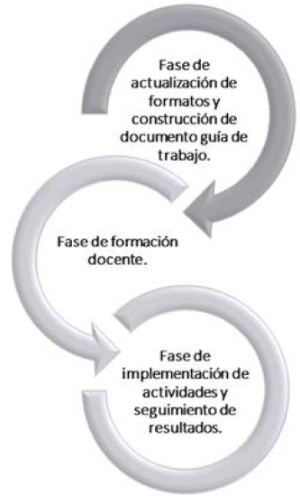 La investigación se desarrolló en tres fases: la primera, de actualización de formatos y construcción de un documento guía de trabajo, la segunda fase de formación docente y una tercera fase de implementación de actividades y seguimiento de resultados (figura 1). En cada una se desarrollaron actividades orientadas a construir una estrategia institucional que permita, por medio de documentos guía del proceso, realizar el diseño, aplicación y seguimiento de actividades de clase para docentes de la IES implicada en esta investigación, así como orientar el trabajo con docentes para el diseño de actividades de clase y propuesta de metodologías para el registro y sistematización de las actividades académicas implementadas con miras al fortalecimiento de competencias genéricas de los estudiantes de un programa académico piloto de la misma IES.