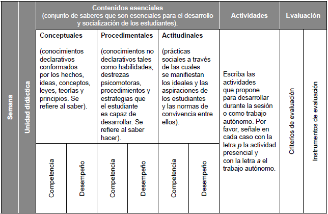 A partir de estas consideraciones se realizó una reestructuración de los componentes que conforman tanto el sílabo, como el plan de trabajo5; estos ajustes respecto al sílabo se evidenciaron en uno de sus apartados denominado “Orientaciones metodológicas”, pues se agregó orientación para el proceso de evaluación del aprendizaje; asimismo fue ampliada la información presentada en las competencias y los indicadores de desempeño, al agregar para las competencias genéricas y específicas las afirmaciones, la evidencia y la descripción, y respecto a los contenidos esenciales se adicionó el nombre de la unidad didáctica y el contenido.