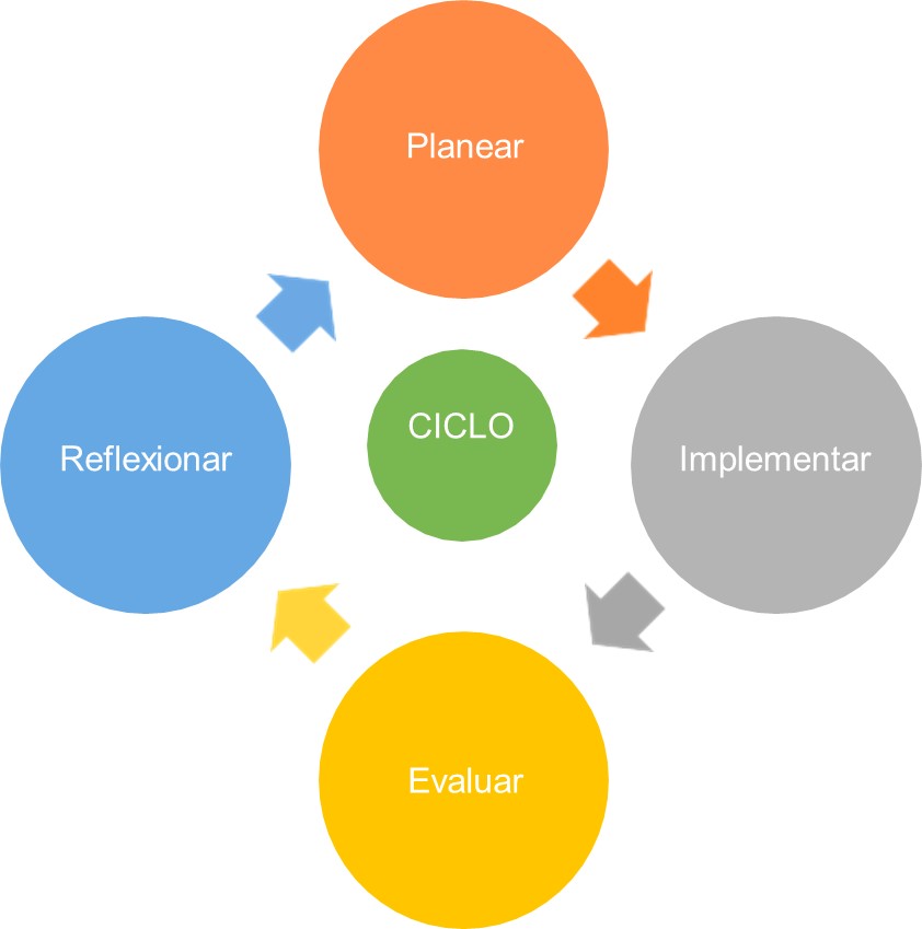 En cuanto al proceso de documentación, la investigación se realizó bajo el análisis en espiral de ciclos de reflexión, el cual se compone de cuatro fases: Planear, Implementar, Evaluar y Reflexionar (PIER), como se muestra en la figura 1.