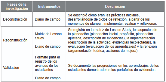 Teniendo en cuenta lo anterior, este estudio se estructuró desde la investigación acción pedagógica referida por Restrepo (2004). En este sentido, se realizó un proceso de deconstrucción que consistió en la identificación de la estructura y fundamentos teóricos de las prácticas pedagógicas estudiadas. Posteriormente se abordó la reconstrucción de la práctica, momento en el que se tomaron decisiones para generar cambios en la enseñanza, lo cual se realizó después del análisis de algunos ciclos de reflexión y se finalizó con la evaluación de las transformaciones de la práctica pedagógica. En la tabla 1, se presentan los instrumentos aplicados en cada fase para recabar la información: