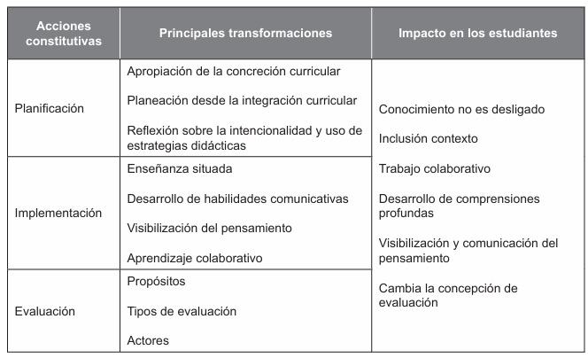 En la tabla 2, se relacionan las principales transformaciones ocurridas en las acciones constitutivas de la práctica pedagógica de los docentes investigadores, y la incidencia en el aprendizaje de los estudiantes.