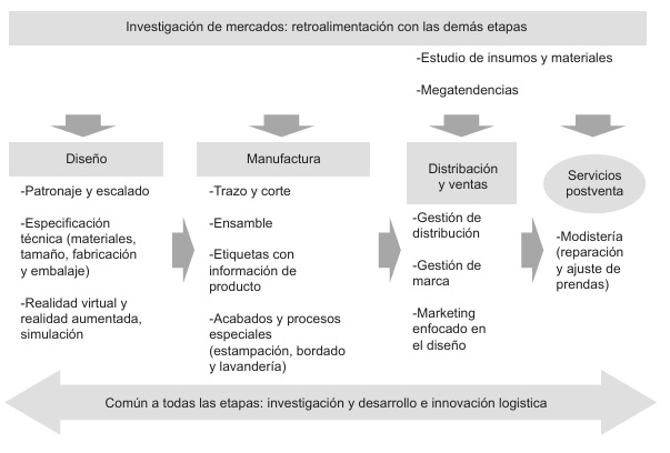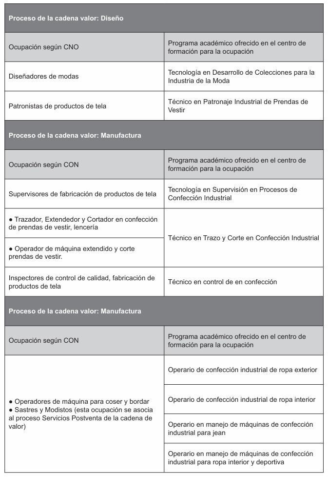 En la cadena de valor del sector se pueden identificar procesos que son transversales a todos los sectores productivos, como es el caso de investigación de mercados, distribución y ventas, o los procesos de investigación y desarrollo e innovación logística. Los procesos que son distintivos de la cadena productiva diseño, confección y moda, en este caso los procesos de diseño, manufactura y servicios postventa, son considerados misionales para los programas de formación que se impartan para el sector, un aspecto en el cual se profundizará en las secciones posteriores de este estudio.