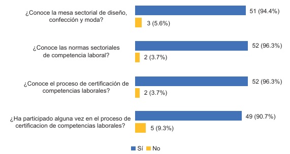En primera instancia, se indagó sobre el nivel de reconocimiento de los instructores frente a la existencia de la Mesa Sectorial de Diseño, Confección y Moda, instancia que se encarga en Colombia del proceso de normalización de competencias laborales, así como el conocimiento sobre las normas de competencia, los procesos de certificación de las competencias y si el instructor había participado en el proceso de certificación de competencias. Los resultados obtenidos se presentan en la Figura 2.