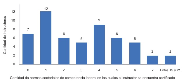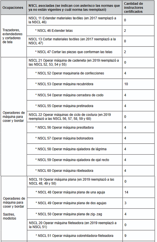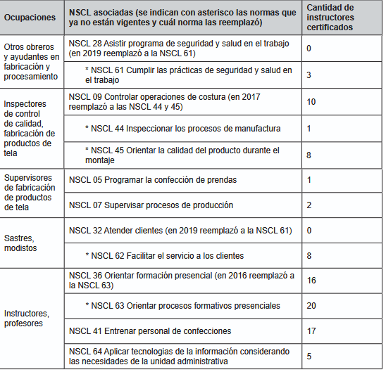 Es destacable que las dos normas en las cuales hay mayor cantidad de instructores certificados están asociadas a la ocupación instructores y profesores, un resultado llamativo dado que, a la fecha, ni el SENA como entidad nacional, ni el Centro en particular, estipulan en su normatividad que los instructores deban estar certificados en esas NSCL para ejercer su labor. También es relevante señalar que en esta esas dos NSCL se encontró la mayor cantidad de instructores certificados de todo el estudio, y que corresponden a la NSCL 36 —Orientar formación presencial— y a la NSCL 41 —Entrenar personal de confecciones—, normas que están vigentes. Esta tendencia confirma que los instructores del Centro objeto de estudio han tenido más interés en certificarse en NSCL asociadas a su labor en aspectos didácticos y pedagógicos, que en NSCL relacionadas con diseño, manufactura y servicio postventa, que son procesos misionales del sector diseño, confección y moda.