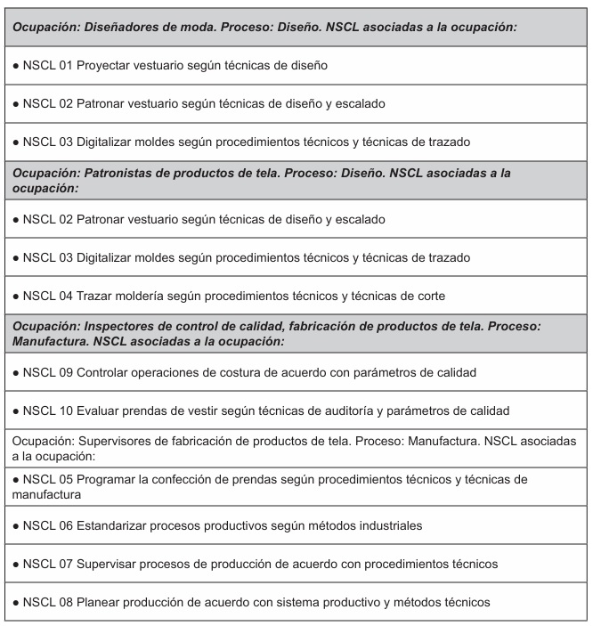 Una vez identificadas las ocupaciones que desarrollan los procesos misionales de la cadena de valor del sector diseño, confección y moda, se procedió a identificar las Normas Sectoriales de Competencia Laboral (NSCL) establecidas en Colombia para cada ocupación, obteniendo los resultados que se presentan en la Tabla 2.