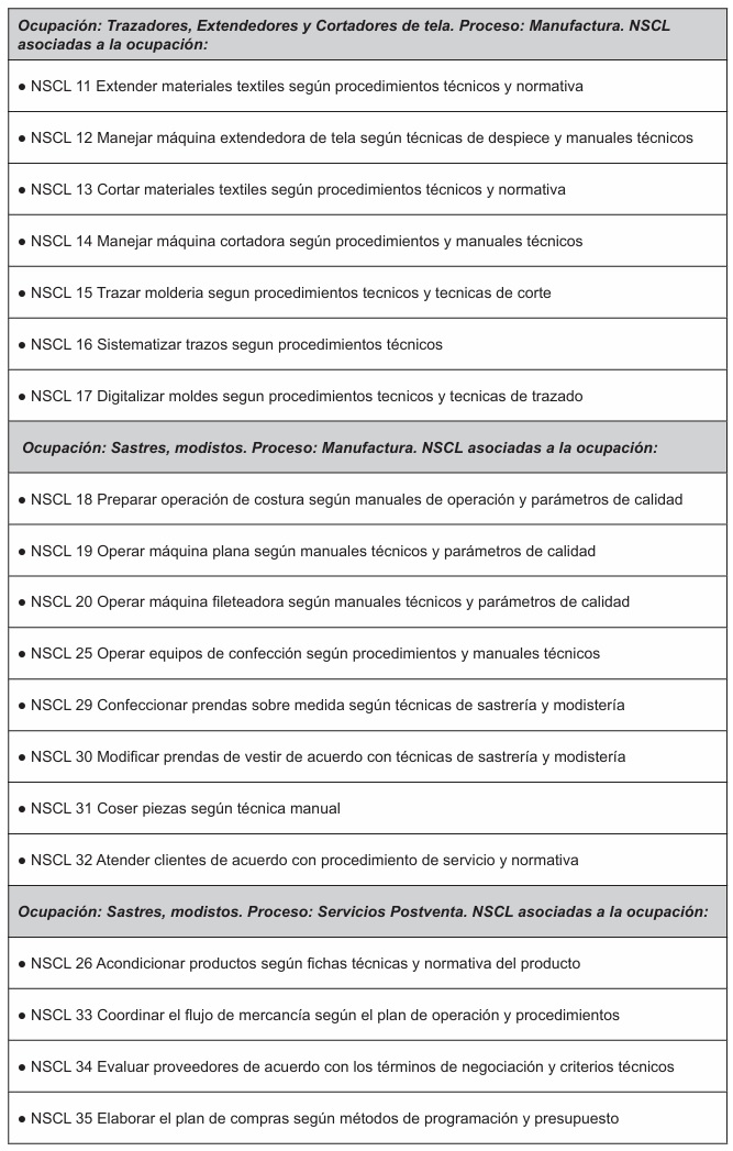 La información consignada en la Tabla 2 evidencia que en el proceso de manufactura se encuentran la mayor cantidad de ocupaciones y NSCL asociadas, pues abarcan los procesos de trazo, corte, ensamble y acabados. Un análisis cruzado de las NSCL requeridas para las ocupaciones de los procesos misionales del sector permite observar que, no existe ninguna NSCL común a cuatro ocupaciones del proceso de manufactura, a saber, supervisores de fabricación de productos de tela; inspectores de control de calidad; fabricación de productos de tela; trazadores, extendedores, cortadores de tela y otros obreros y ayudantes en fabricación y procesamiento. En el caso de las dos ocupaciones asociadas al proceso misional de diseño, es de resaltar que comparten la NSCL 03 -digitalizar moldes según procedimientos técnicos y técnicas de trazado. Ya en el caso de la ocupación sastres y modistas, puede observarse que las normas NSCL 25 -operar equipos de confección según procedimientos y manuales técnicos- y NSCL 26 -acondicionar productos según fichas técnicas y normativa del producto- son comunes a la ocupación otros obreros y ayudantes en fabricación y procesamiento.