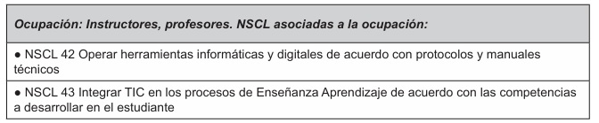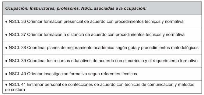 En la Tabla 3 se presentan las NSCL estipuladas en Colombia para la ocupación profesores e instructores.