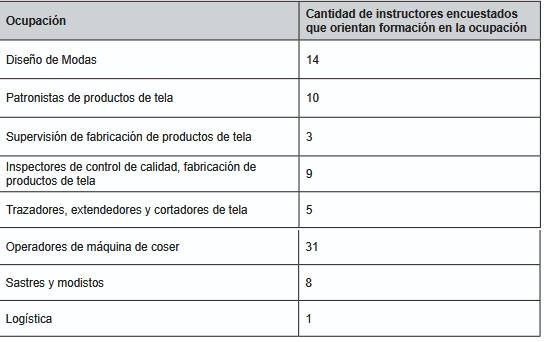 Se encuestó a la totalidad de los 54 instructores del Centro de Formación en Diseño Confección y Moda que imparten formación en la línea medular de los programas presentados en la Tabla 1, recordando que dichos programas académicos están diseñados para las ocupaciones que también se mencionan allí. En la Tabla 5 se presenta la cantidad de instructores encuestados que imparten formación en cada una de las ocho ocupaciones de interés.