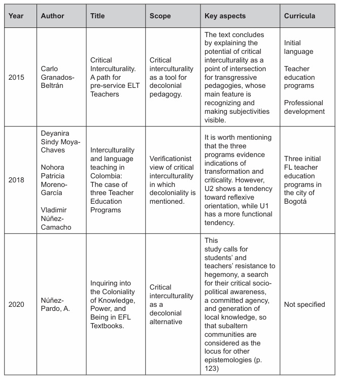 For the sake of the review, although we found works embracing the decolonial turn in order to spot colonial situations experienced in the ELT field in other issues, in the following Table 1, we just paid attention to the works explicitly related to critical interculturality in relation to decolonial key aspects, written by scholars in Colombia. It is also worth mentioning that the decolonial studies with involvement of Colombian philosophers date from the final third of the 90s (Santiago Castro-Gómez y Ramón Grosfoguel), which means that its ratio of influence is via taking into account that the first study in critical interculturality from a decolonial perspective is just beginning to blossom in the ELT field in the country. Based on Table 1, it might be argued that the decolonial turn in ELT is still in an early stage of development. Granados- Beltrán (2015) is the first author who has benefited from critical interculturality as a tool for decolonial pedagogy to make pre- service ELT teachers’ subjectivities visible in initial teacher education programs. In this respect, the author problematizes the hegemony of native-speakerism and its impact on disqualifying “licenciatura” programs and colonizing student-teachers’ beliefs to focus more on proficiency than inequalities. The review of a path to adopt a decolonial pedagogy takes the author to profiting/benefiting from critical interculturality and transgressive pedagogies to subverting initial teacher education and professional development programs.