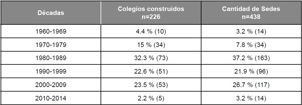 Es innegable que estos espacios se encuentran armonizados con las normas del Estado, cumpliendo mayoritariamente con los aspectos técnicos, en especial, metros cuadrados por estudiante, tipo de espacio, canchas multiuso, materiales requeridos, procedimiento y protocolo de construcción; sin embargo, un número considerable de estas instituciones, 168 que equivalen al 74.3 %, fueron construidas varios años atrás de la publicación y obligatoriedad de las normas. En este caso pareciera ser que la norma se adecua a una realidad material prexistente sin resolver problemas asociados a las apuestas educativas y curriculares, o sin incluir en su definición el papel que juegan las ideologías en la configuración de los edificios escolares que requiere el país.