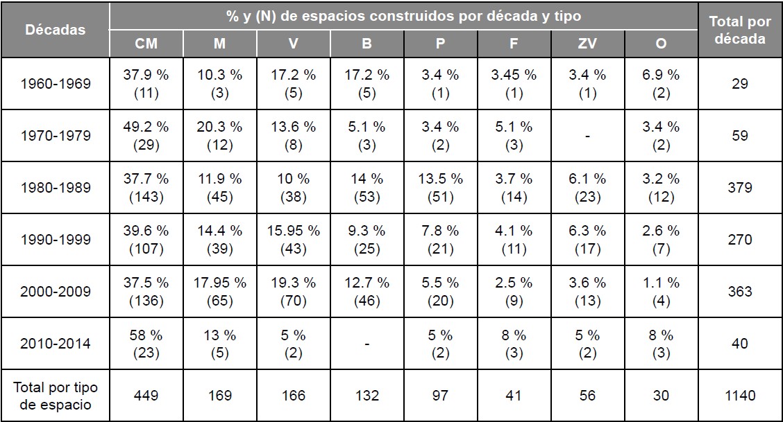 El análisis estadístico muestra un evidente y progresivo aumento de nuevas instituciones educativas que van de la mano con el crecimiento poblacional y espacial de la ciudad ( Departamento Administrativo Nacional de Estadística [DANE], 2018); sin embargo, es en los años 80, como se identifica en la tabla 1, cuando se presenta el mayor incremento reflejado por un notorio impulso en la inversión del Estado y el avance en las políticas educativas. No obstante, los espacios de la educación física siguen siendo los mismos cuando se trata del diseño del espacio, a saber, canchas multiuso (CM), microfútbol (M), voleibol (V), baloncesto (B), patio (P), futbol (F), zona verde (ZV), y otro (O) (véase la tabla 2), pero con procesos y materiales de construcción de mayor calidad.