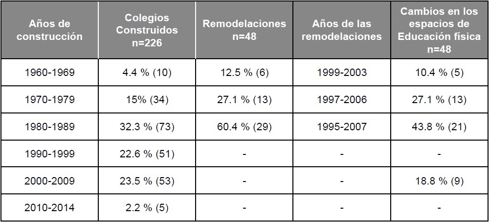 Siguiendo el análisis por décadas, los cambios estructuralesasociados a las remodelaciones y, particularmente, en los espaciosde la educación física van de la mano con la construcción de nuevos colegios; sin embargo, es importante precisar que dichas remodelaciones se realizaron en colegios construidos entre 1960 y 1989. En este sentido, se identifica un importante trabajo de actualización estructural realizado al 56.1 % de las instituciones construidas en este periodo, no obstante, es importante señalar que la intervención más alta se hizo en colegios construidos entre 1980 y 1989, es decir, de los 73 colegios registrados en este periodo, 29 fueron intervenidos. En la década precedente (1970-1979) los datos muestran una intervención en 13 de 34 edificaciones, y 6 de 10 entre 1960 y 1969. En este sentido, de las 48 remodelaciones hechas a los 226 colegios incluidos en este estudio, 12.5 % corresponde a colegios construidos entre 1960 y 1969; otro 27.1 % entre 1970 y 1979, y 60.4 % a los años 1980-1989; al respecto, es importante saber que los trabajos de remodelación ocurrieron entre 1995 y 2007, periodo en el cual las normas técnicas cuentan con mayor desarrollo y calidad; no obstante, dichas intervenciones tampoco reflejan novedades en el diseño de los espacios de la educación física. Vale agregar que los colegios construidos a partir de los años 90 no evidencian ningún tipo de remodelación, pues se trata de edificaciones relativamente nuevas ajustadas a nuevos criterios técnicos que siguen las mismas pautas frente al diseño, en especial, canchas multiuso para la educación física.