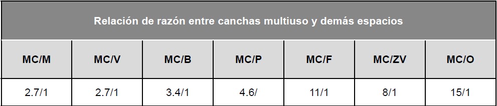 Frente a estos datos, resulta revelador el grado de asociación entre espacios que presentan características similares, es decir, locaciones diseñadas para prácticas deportivas de conjunto que se desarrollan en espacios reducidos con un número no mayor a 12 sujetos, de igual forma, es evidente que a medida que el tipo de espacio se diversifica, la relación de razón se hace más amplia tal como muestra la tabla 1. Mientras la diferencia entre canchas multiuso y canchas de microfútbol, voleibol y baloncesto es de 2.9 en promedio, la relación entre canchas multiuso y zonas verdes es de 7, es decir, un poco más del doble y cuatro veces más en la relación canchas multiuso y otros espacios.