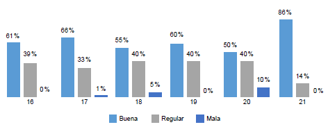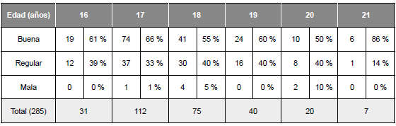 En la caracterización se establece un cuestionamiento frente al autocontrol, autoexigencia y responsabilidad en las actividades acaémicas de los estudiantes, con el fin de obtener información de la perspectiva que tienen los estudiantes de sí mismos frente a su proceso de formación. Las respuestas cualitativas se establecieron como buena, regular o mala. El total de los estudiantes que respondieron al cuestionamiento fue de 285, los cuales se clasificaron por edades y se obtuvieron los resultados que se muestran en la tabla 4.