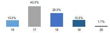 Si se comparan las figuras 13 y 15 se puede corroborar que los estudiantes con edades entre los 17 y los 18 años que reprueban el curso de Cálculo Diferencial reconocen que poseen problemas con el manejo de la ansiedad ante las pruebas de evaluación. Además, es consistente con la hipótesis de Beltrán (2015) quien considera que “la edad de ingreso a la universidad es un factor importante para explicar el rendimiento académico de los primeros ciclos, pues su impacto decrece en los ciclos más avanzados, es decir que cuanto mayor es el rango de edad, mayor es el rendimiento académico” (p. 23). Esto se observa en el análisis realizado frente a la relación de la edad con el grado de reprobación de la asignatura de Cálculo Diferencial, pues se observa que el porcentaje de reprobación decrece con el aumento de la edad de los estudiantes. Se asume una actitud más responsable y de interés por completar su proyecto de formación en las edades de mayor madurez.