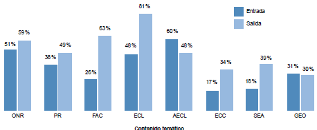 En el tema de ecuación cuadrática, a la entrada del refuerzo, solo un 17 % de los estudiantes contesta correctamente la pregunta y, después del refuerzo, el porcentaje aumenta a 34 %, sin embargo, este porcentaje sigue siendo bajo.
