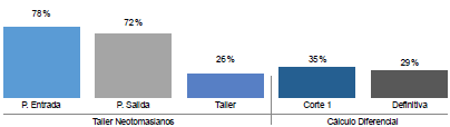 De los estudiantes que participaron en el taller y presentan nota del curso de Cálculo Diferencial, el 35 % reprueba el primer corte académico, que corresponde al 35 % de la nota definitiva del curso. Este porcentaje de reprobación disminuye a un 29 % en la nota definitiva de cálculo diferencial, porcentaje que a pesar de los esfuerzos del taller de refuerzo y las diversas estrategias implementadas por el DCB está por encima del porcentaje promedio de todos los espacios académicos (alrededor de un 15 % en los últimos semestres).