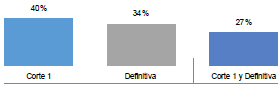 En la base de datos se filtran las notas de aquellos estudiantes que reprueban la prueba de salida junto con el primer corte, para obtener un total de 110 estudiantes, que corresponden al 40 %. Los estudiantes que no aprueban la prueba de salida y el curso de Cálculo Diferencial son 93, que corresponden al 34 %. Mientras que el 27 % reprueba la prueba de salida, el primer corte y el curso de Cálculo Diferencial, como se observa en la figura 3.