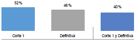 Al tomar la base de las notas definitivas del taller de refuerzo, se filtran los estudiantes que reprueban el taller y se obtiene un total de 99 estudiantes; de estos, quienes perdieron el primer corte del curso de Cálculo Diferencial fueron 51, lo cual corresponde al 52 %. Y de los estudiantes que reprueban el taller, los que reprueban el curso de Cálculo Diferencial es un 46 %. Finalmente, quienes reprueban el taller, el primer corte y el curso de Cálculo Diferencial son alrededor del 40 % (ver figura 4).