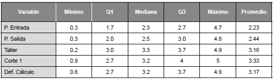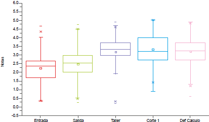 El diagrama de la nota del taller de refuerzo presenta menos dispersión que los diagramas de las pruebas de entrada y salida (ver figura 5). La nota promedio de taller es 3.16, esto se debe a las diversas actividades complementarias realizadas durante el taller de refuerzo, el 50 % de las notas se encuentran entre 3.0 y 3.7. En los tres diagramas correspondientes al taller de refuerzo se presentan notas atípicas inferiores, esto se debe al abandono del taller o la falta de esfuerzo de los estudiantes. El diagrama de caja correspondiente a las notas obtenidas durante el primer corte del curso de cálculo diferencial presenta una gran dispersión y asimetría, con una nota promedio de 3.3, esto se debe a la etapa de adaptación del estudiante durante las primeras 6 semanas de inicio. También influye la adaptación a la metodología del docente y la adquisición de la responsabilidad en las actividades académicas.