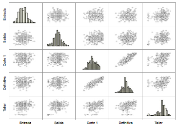 Las notas definitivas del curso de cálculo diferencial presentan una menor dispersión que las notas del primer corte, con una nota promedio de 3.17, menor que la nota promedio del primer corte, solo el 25 % de las notas están por encima de 3.7 y el 25 % de las notas es inferior a 2.7, lo cual recuerda que el porcentaje de reprobación para los estudiantes que tomaron el taller de refuerzo es del 27 %. Las notas mínimas del taller, del primer corte y del curso de Cálculo se deben al abandono o cancelación del espacio académico. Con el fin de encontrar alguna relación entre las notas de la prueba de entrada, la prueba de salida y la nota del taller de refuerzo se construyen una matriz de dispersión, donde los resultados obtenidos se muestran en la figura 6.