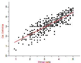 En el diagrama de dispersión se puede observar que no hay una correlación entre las notas de la prueba de entrada con las notas de la prueba de salida, no hay correlación entre la prueba de entrada y la nota del taller de refuerzo, tampoco hay correlación entre las notas de la prueba de entrada con las notas del curso de cálculo diferencial. Las notas de la prueba de salida no se relacionan con ninguna de las otras variables, lo mismo ocurre con las notas del taller de nivelación. Solo se presenta una correlación entre las notas del primer corte y las notas definitivas del curso de Cálculo Diferencial, la correlación es directa (positiva) y fuerte, en la figura 7 se muestra la recta de ajuste (o de regresión), el coeficiente de correlación es 0.708.