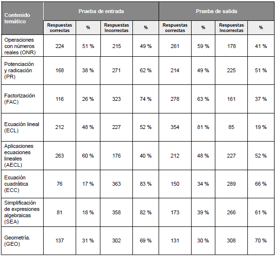En conclusión, a partir de las pruebas de entrada y de salida del taller de refuerzo se evidencia que el porcentaje de estudiantes que responde correctamente a las preguntas de los estándares evaluados en general es bajo; los mayores problemas se presentan en los temas de potenciación, radicación, factorización, ecuaciones cuadráticas y simplificación de expresiones algebraicas.