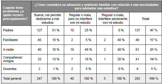 El cuestionamiento que representan los datos es “¿a quién acude si presenta problemas?” y “¿cómo considera su situación y ambiente familiar en relación con las necesidades para realizar sus estudios?” Por lo tanto, los valores cualitativos se estiman como bueno, regular o malo.