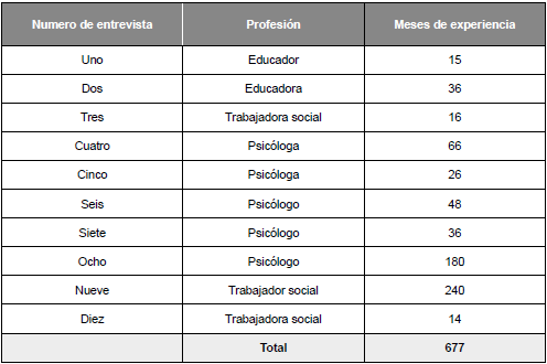 Sobre las características generales de los profesionales, cinco de ellos son psicólogos, tres son trabajadores sociales y dos son educadores o formadores de vida, todos ellos con años de experiencia en el contexto del SRPA y con amplia formación y actualización en procesos sociales, en la tabla 1 se exponen los meses de experiencia reportada en el momento de la toma de datos.