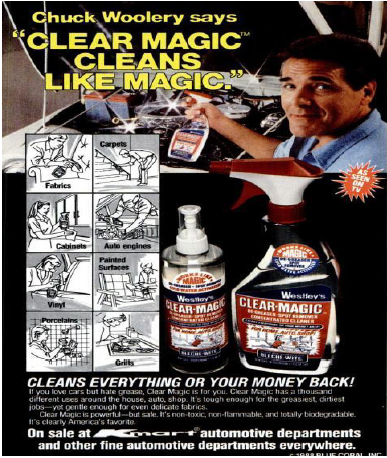 ¡Limpia todo o te regresamos tu dinero! Si amas los autos pero odias la grasa, ”Clear Magic“ es para ti. ”Clear Magic“ tiene miles de usos diferentes en toda la casa, auto y taller. Es lo bastante fuerte para los trabajos más grasientos y sucios – pero lo suficientemente suave para las telas más delicadas. ”Clear Magic“ es potente – pero seguro. No es tóxico, no es inflamable y es totalmente biodegradable. Es claramente el favorito de América. De venta en ”Kmart“ y otras tiendas departamentales automotrices exclusivas.