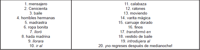 Los participantes pasaron al salón y se sentaron en butacas. En un primer momento, que denominamos de “ preprueba”, las investigadoras entregaron una hoja con los 20 reactivos que se muestran en el Anexo A y se les pidió que escribieran el significado de cada palabra, frase o expresión en inglés, si lo sabían. Cuando cada participante entregaba su preprueba a la investigadora, esta le dijo que todas las palabras de la lista pertenecían a un mismo cuento y le preguntó “¿Sabes de cuál cuento se trata?”. La investigadora escribió SI o NO en su hoja de preprueba según lo que hubiera respondido el participante. Cuando todos los participantes entregaron la preprueba, se les entregó el texto en inglés con el cuento de La Cenicienta y una nueva lista impresa con las palabras y frases a contestar. La investigadora dio las siguientes instrucciones: “Contesta las mismas 20 preguntas, pero haciendo uso del texto”. A esta condición en que los participantes emplearon el texto para deducir el significado de los 20 reactivos lo denominamos como “ posprueba”. Conforme iban entregando la hoja de posprueba, se les pedía que salieran del salón y esperaran a ser llamados por una investigadora para completar de manera individual la tarea lectora 2.