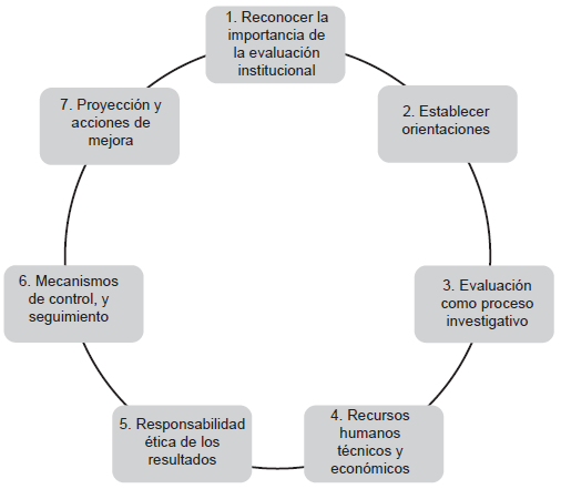 Para que la evaluación tenga el impacto es necesario organizar un marco de comprensión y acción, por eso es necesario reconocer la base epistemológica desde donde se aborda, el marco referencial y desde allí organizar los principios orientadores y los fines de esta, pues las instituciones de acuerdo con su historia, sus intereses y prioridades enfatizan en aspectos que es necesario revalorar, reconceptualizar, que necesariamente no son los mismos. Pues las instituciones crecen, se modifican, construyen nuevos horizontes que hacen pensar en ese continuo movimiento en espiral. Por eso las orientaciones no pueden ser las mismas todos los años. En ese orden de ideas, es necesario desde este marco atender los siguientes aspectos: