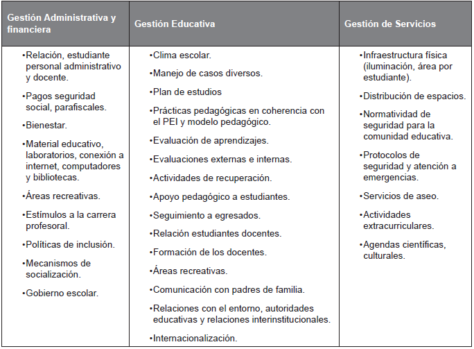 Una evaluación que no tenga en el centro el sujeto se vuelve árida, por ello es fundamental considerar los actores de la evaluación, en tanto es necesario la comprensión de sus modos de ser y hacer, agenciándolos como sujetos propositivos y como piezas clave del cambio. Ahora bien, para garantizar la participación de todos los actores, es conveniente establecer medios y mecanismos de interacción y comunicación entre los diferentes estamentos, así como tener presente el proceso de planificación en su conjunto, considerando tiempos, espacios, recursos físicos, tecnológicos, entre otros. De acuerdo con Buendía, L. y García (2010) se reconocen dos enfoques de evaluación, uno centrado en aspectos de eficiencia, factores económicos y de optimización de recursos, modelo que suele llamar la atención de muchos padres de familia ( Olave y Vélez, 2017). Y el otro, hace énfasis en lo educativo y pedagógico en donde se centran los esfuerzos en la organización del proceso de enseñanza que se orienta hacia la consecución de los objetivos y la mejora de la calidad. En la tabla 1 se proponen los aspectos a considerar en el proceso de evaluación institucional atendiendo a la correlación existente entre los dos aspectos y cómo contribuyen a la mejora de la institución. Se estructuran tomando en cuenta lo planteado por el MEN (2008), y otros que los autores establecen como fundamentales incluir.