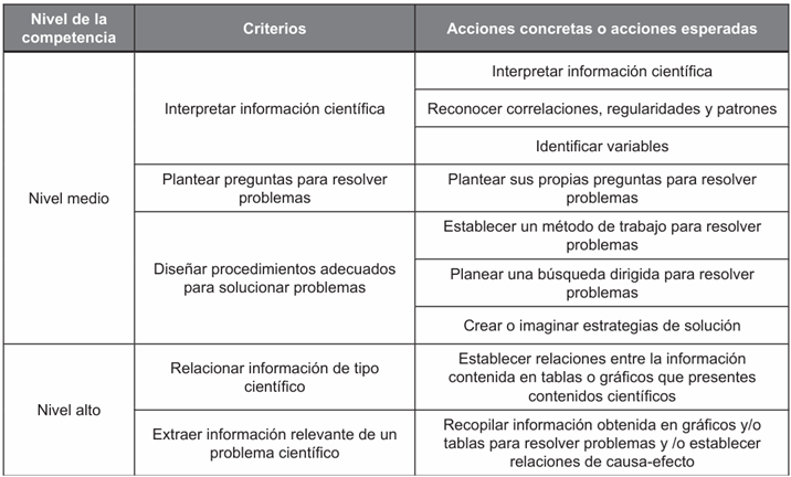 La competencia indagación se define como la capacidad para plantear preguntas y procedimientos adecuados, así como para buscar, seleccionar, organizar e interpretar información relevante para dar respuesta a interrogantes ( ıcfes, 2015 ). Indagar en ciencias implica observar la situación, plantear preguntas, buscar la relación entre causa y efecto, recurrir a fuentes de información, hacer predicciones, plantear experimentos, identificar variables, realizar mediciones, organizar y analizar resultados ( ıcfes, 2015 ; men, 2018 ; Quintero, 2018; Cruz Malpartida, 2020).