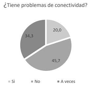 Esto evidenció aspectos que determinaron el tránsito a la virtualidad y permearon la experiencia, entonces se plantearon nuevas dinámicas para los encuentros que impulsaron la participación de los estudiantes y tuvieron en cuenta sus condiciones de conectividad, ya que, solo el 45,7 % de los estudiantes manifestaron no tener problemas de conectividad, mientras el 54,3 % restante tenía dificultades en el acceso. ( Ver figura 2).