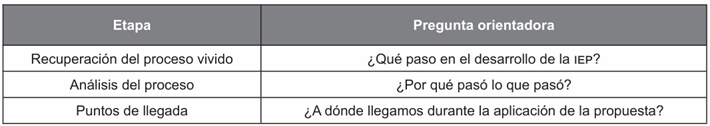 En el proceso de sistematización se tomaron las etapas de la iep: plan de acción del proceso anterior, contextualización, construcción de la pregunta, diseño de la trayectoria de investigación e indagación, a fin de interpretarlas e identificar los saberes construidos por los estudiantes, tomando como fuentes, los diarios de campo, así como, las relatorías, talleres, formularios y matrices, realizados en cada sesión.